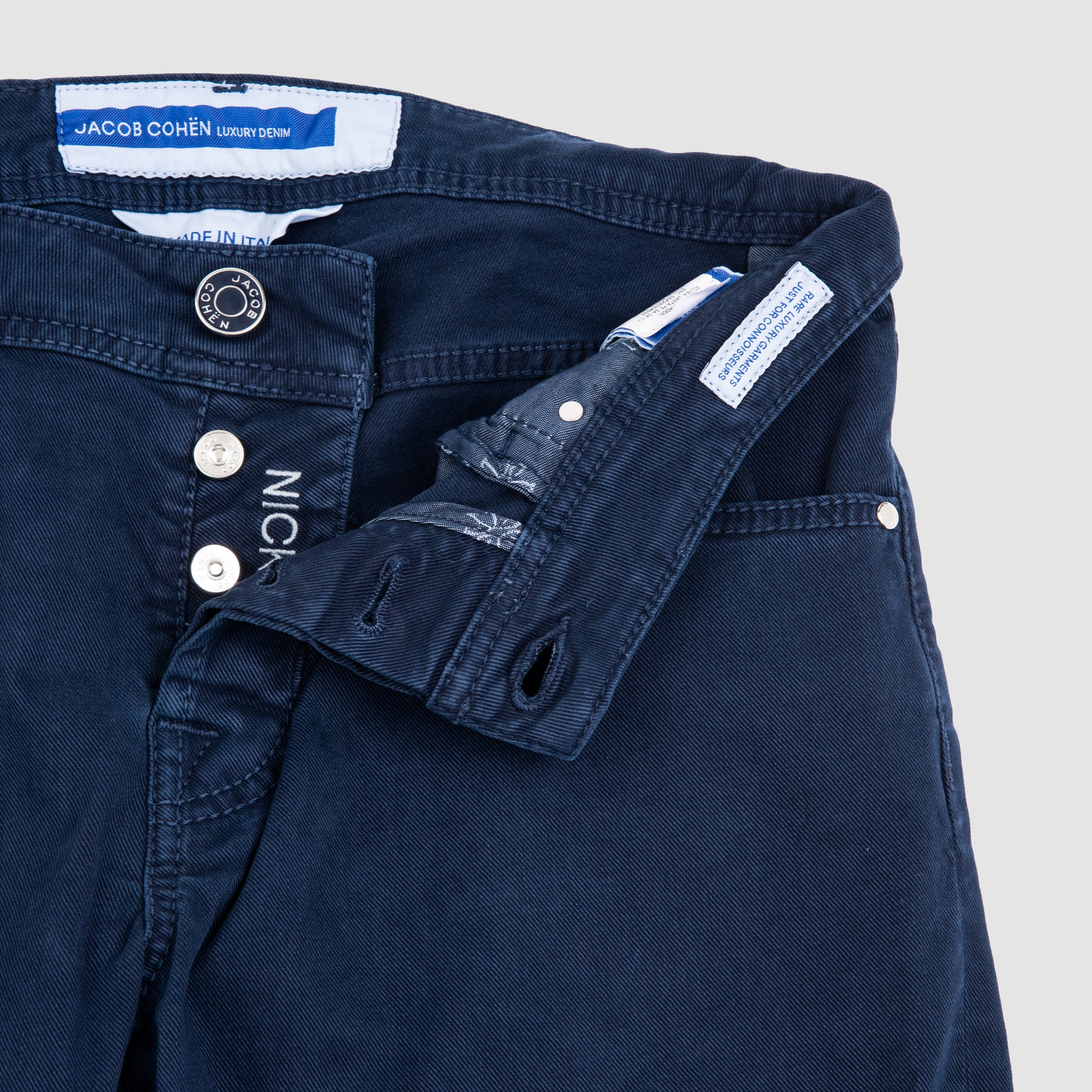 - Button fly closure with branded button detail