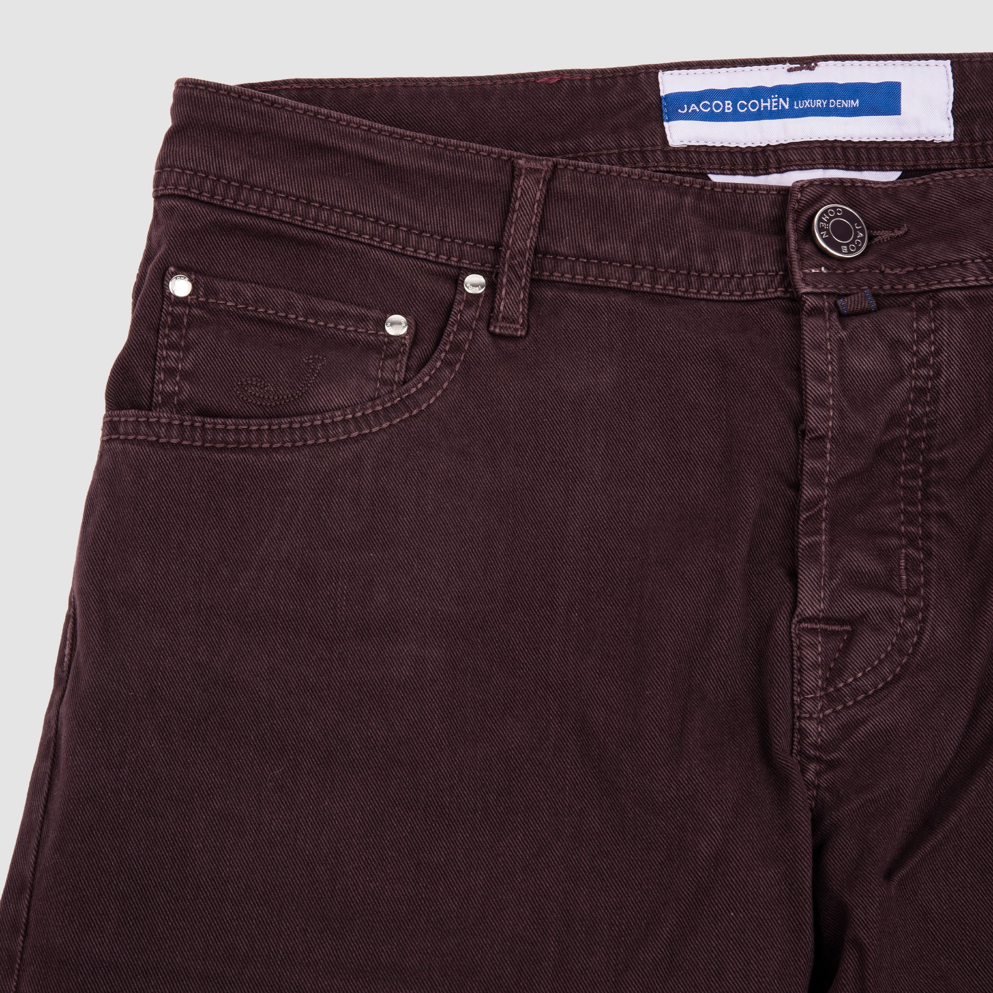 - Burgundy leather patch on the back waistband