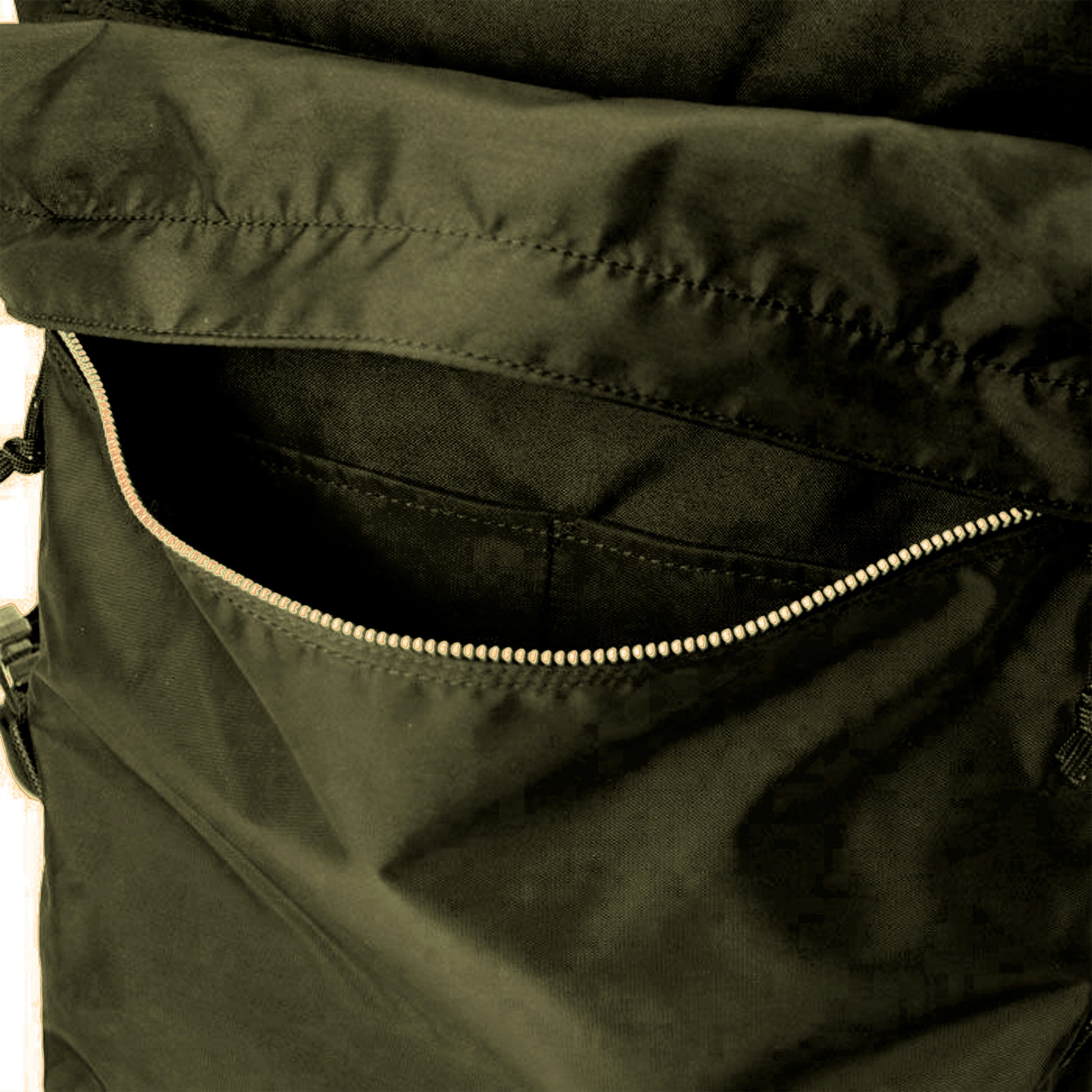 Industrial material is used for outer material, which is made of 210 denier 6 nylon high tenacity yarns. This material is usually used as a foundation material of rubber boats, etc. Therefore, unlike regular materials for clothing and bags, it is not produced to be dyed. But we dyed it on purpose to create unique shiny texture and vertical lines for a chuff impression and a further military touch.