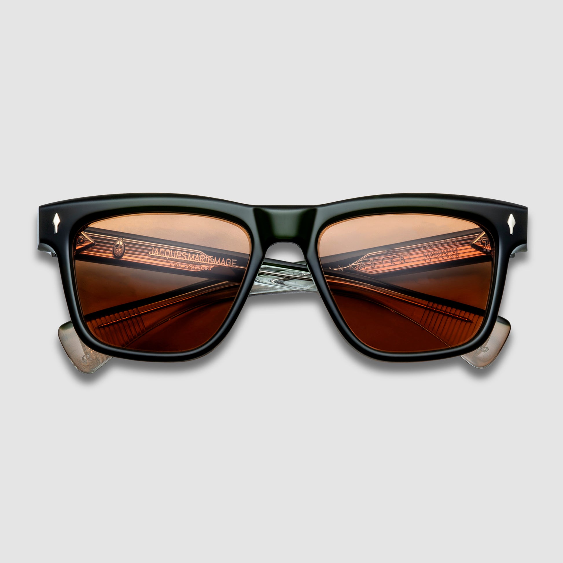 - Green 10mm cellulose acetate frame custom acetate temples featuring precious metal hardware and orange cr39 lenses
