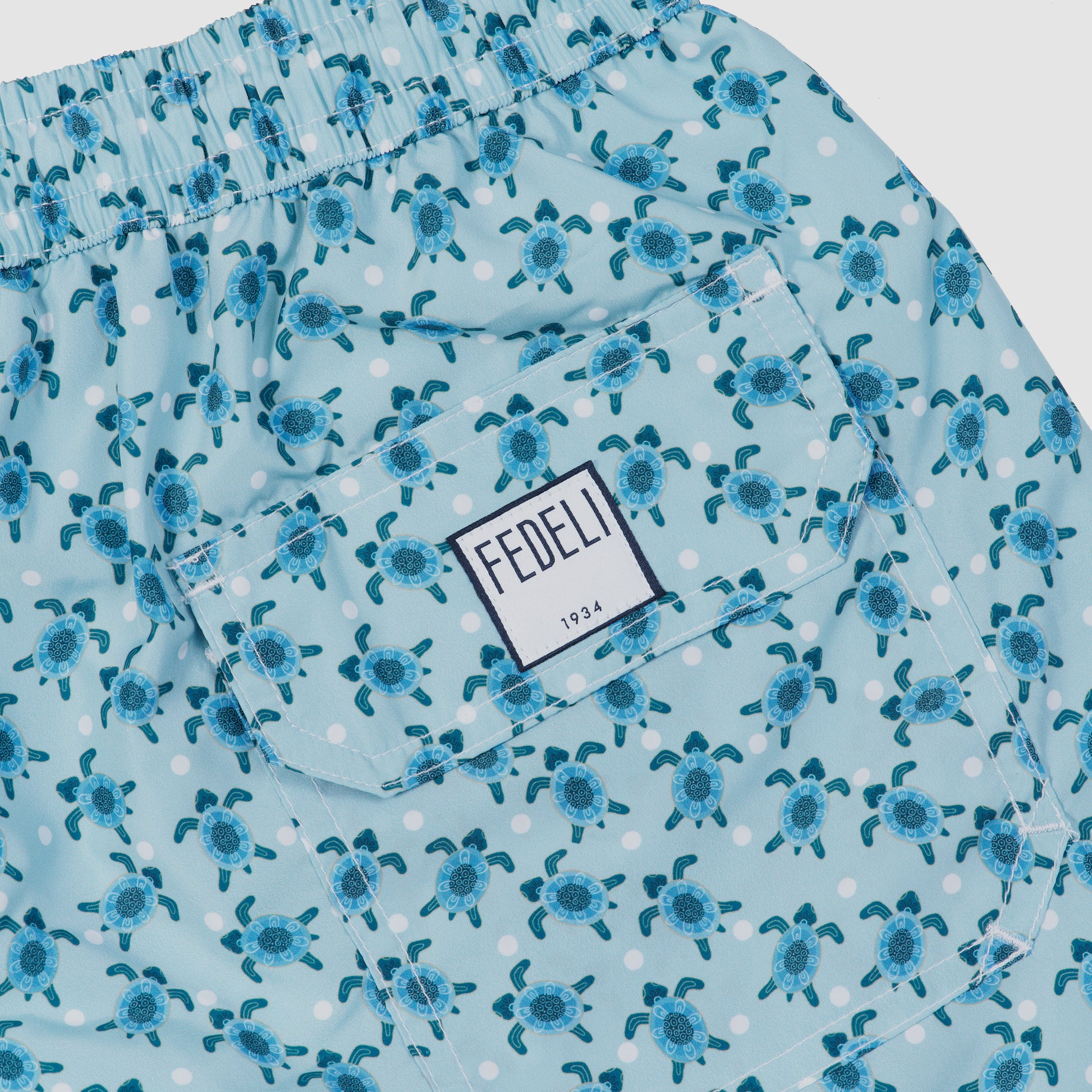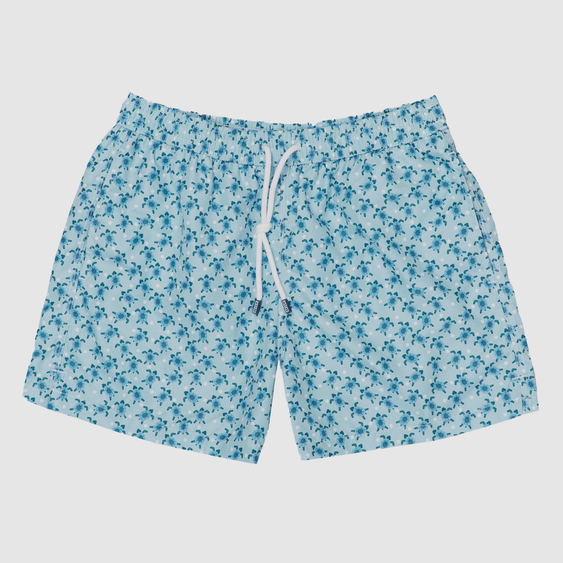 Dive into the Mediterranean spirit with the Madeira Airstop Stampato swim trunk, featuring a playful and refreshing aqua turtle print. Crafted from luxurious polyester, it offers a lightweight and quick-drying performance, drying out in only 90 seconds. The light blue background is adorned with an all-over sea turtle motif, capturing the essence of island life and nautical adventure. It is the perfect choice for the man who appreciates high-performance swimwear with a spirited, artistic design.