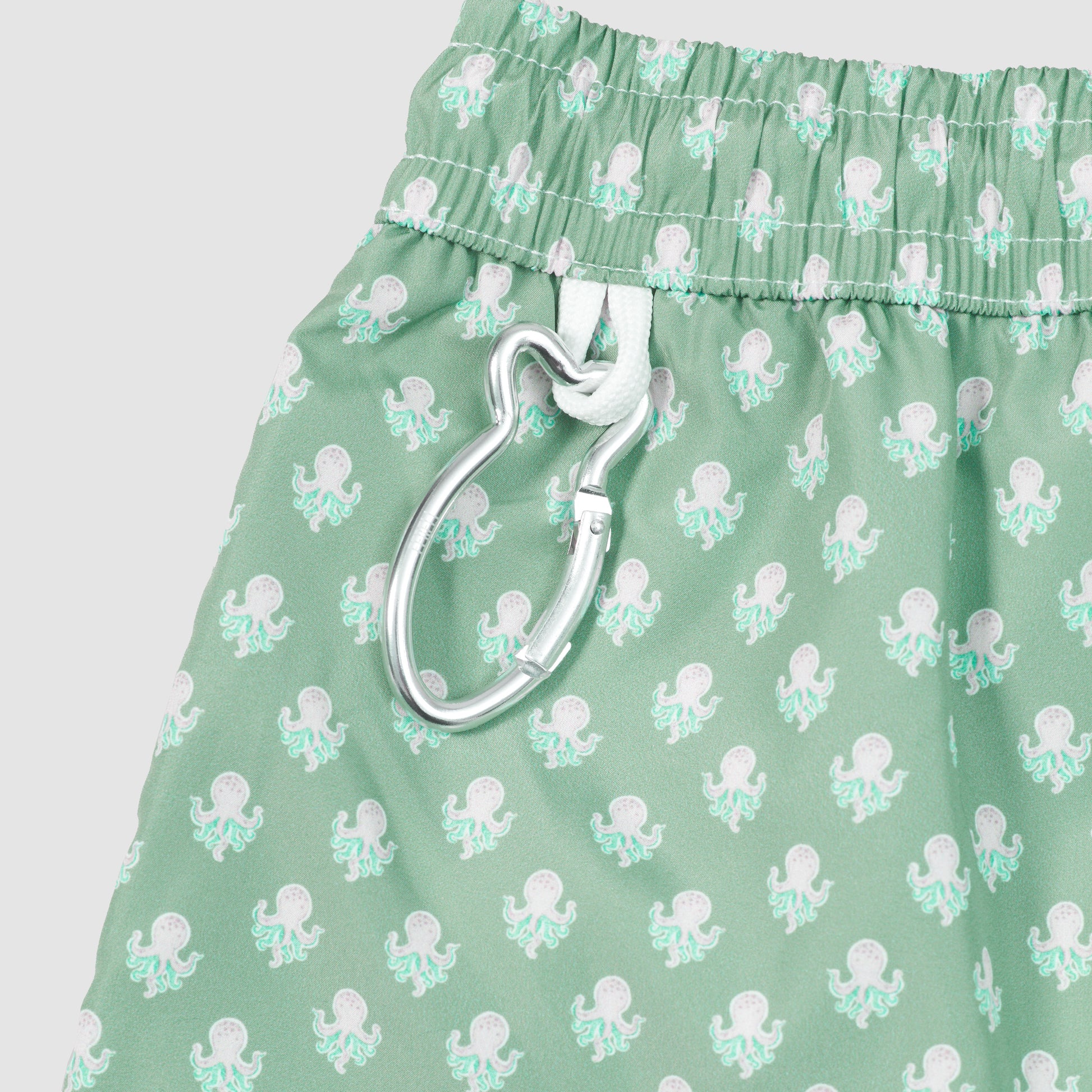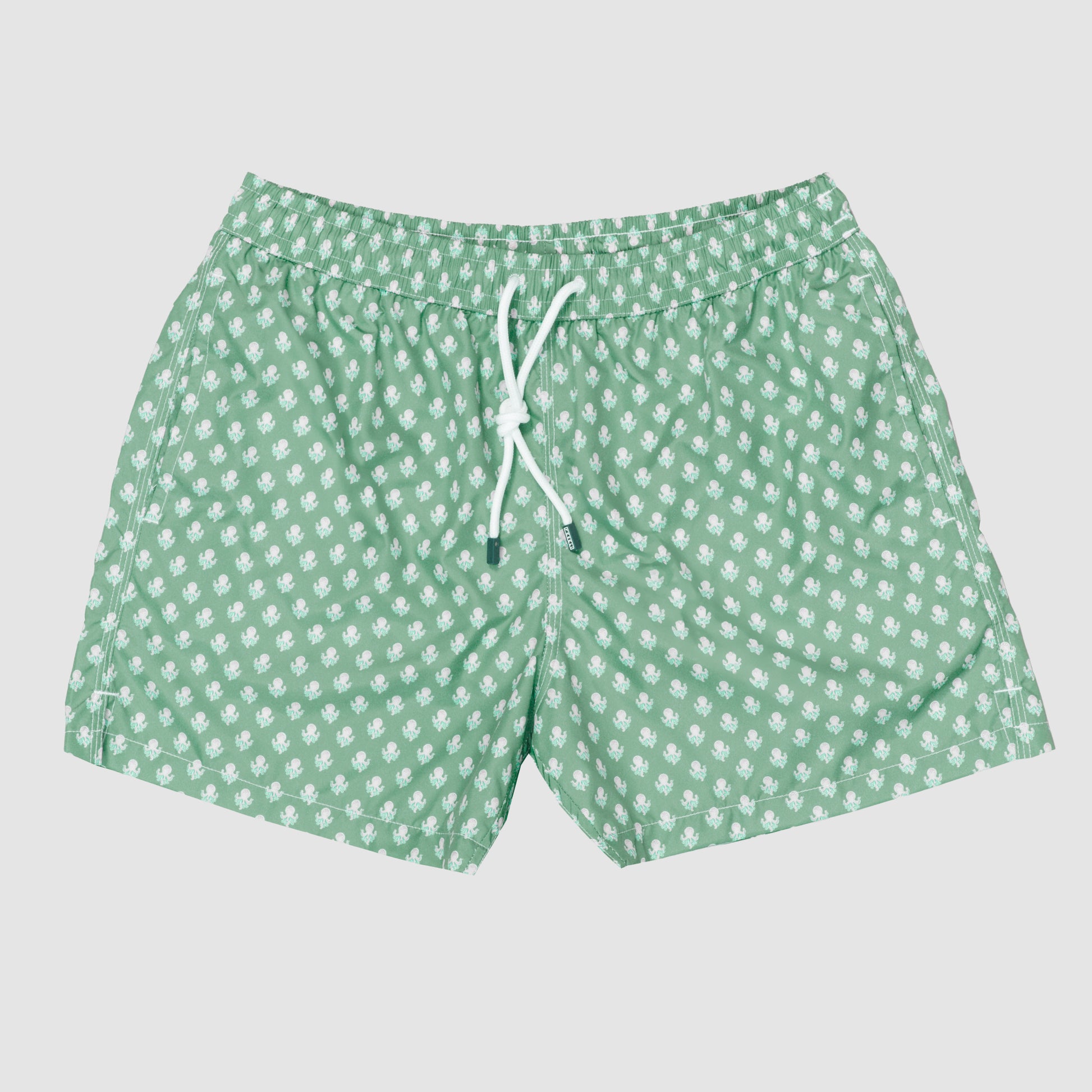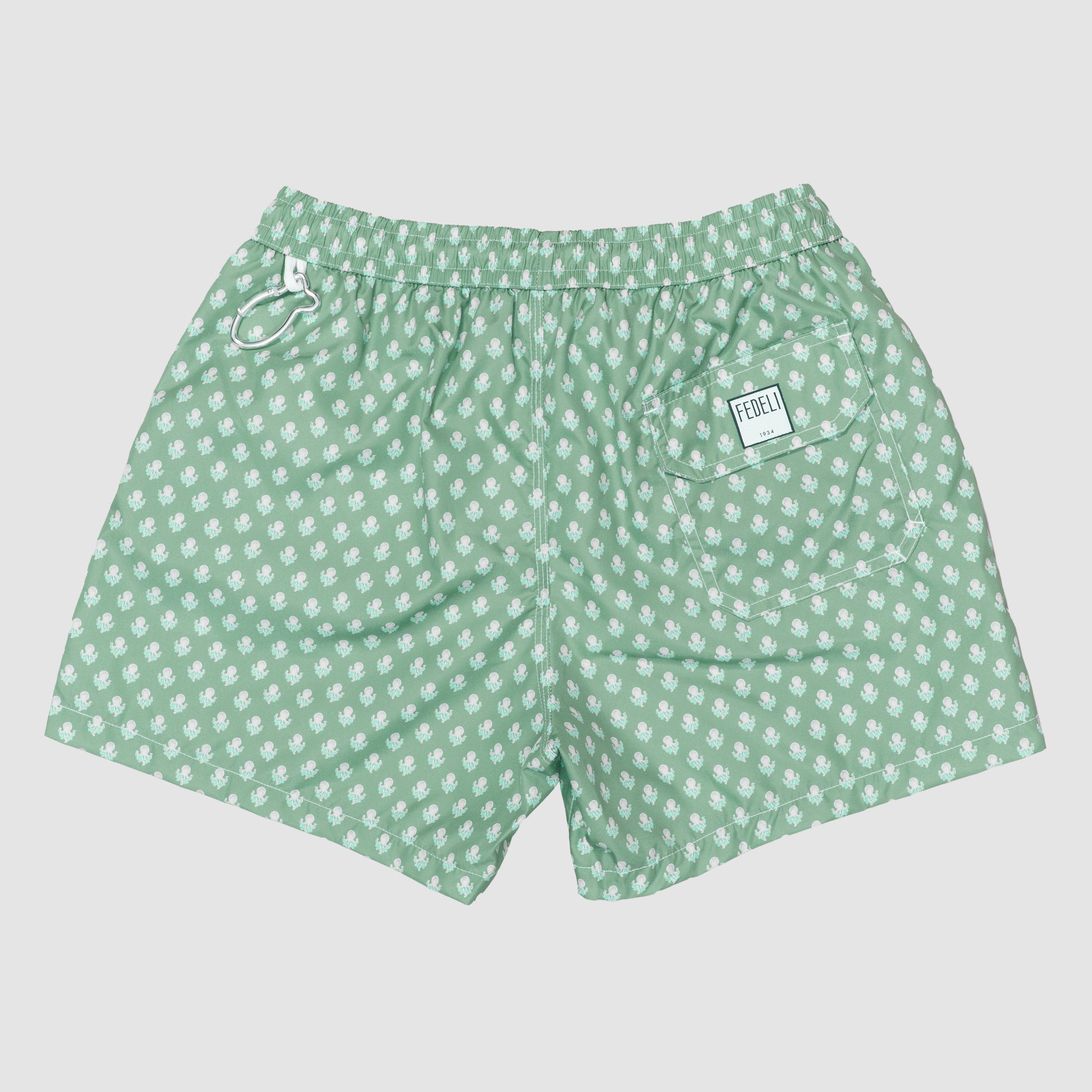Add a fresh and energetic touch to your summer rotation with the Madeira Airstop Stampato swim trunk in green. Crafted from luxurious polyester, it offers a lightweight and quick-drying performance, drying out in only 90 seconds. The soft green hue is beautifully complemented by a white octopus print, creating a refreshing aesthetic inspired by clear tropical waters. It is a sophisticated yet fun garment that embodies the relaxed luxury of the Fedeli lifestyle.