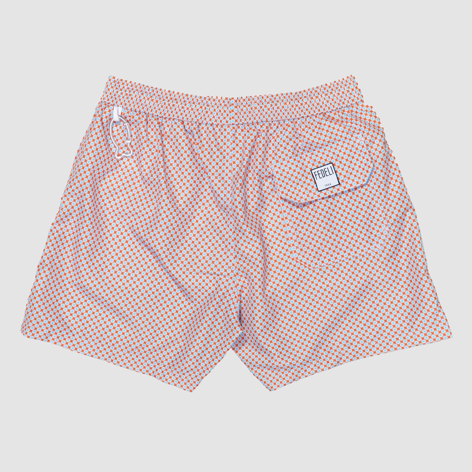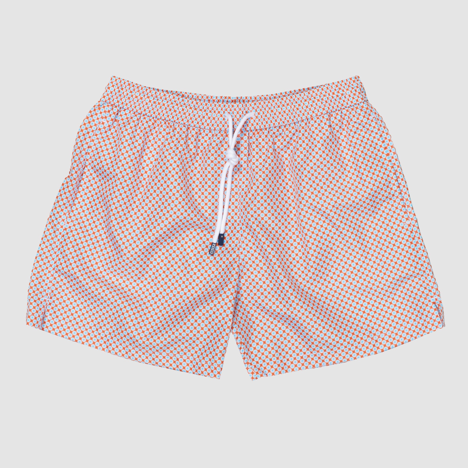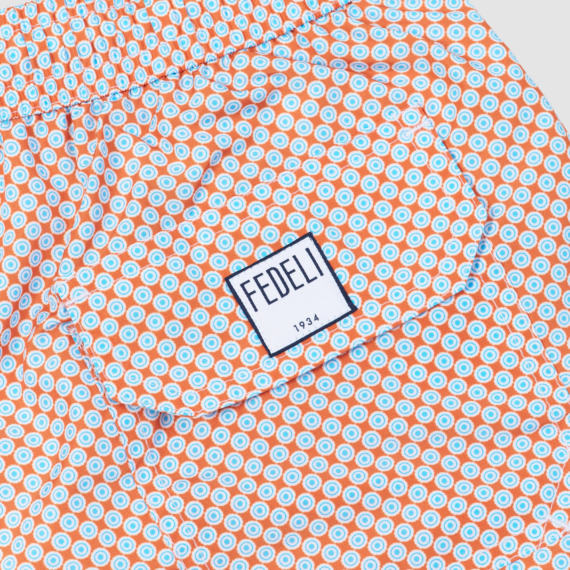 Embrace the Italian summer in unparalleled style with the iconic Madeira Airstop Stampato swim trunk. Crafted from luxurious polyester, it offers a lightweight and quick-drying performance, drying out in only 90 seconds for maximum convenience. This eye-catching version features a vibrant orange background adorned with an intricate light blue circular print, creating a geometric aesthetic that is both playful and sophisticated. Perfect for the man who wants to stand out at the beach club, it perfectly blends Fedeli's technical innovation with a bold, artistic flair.