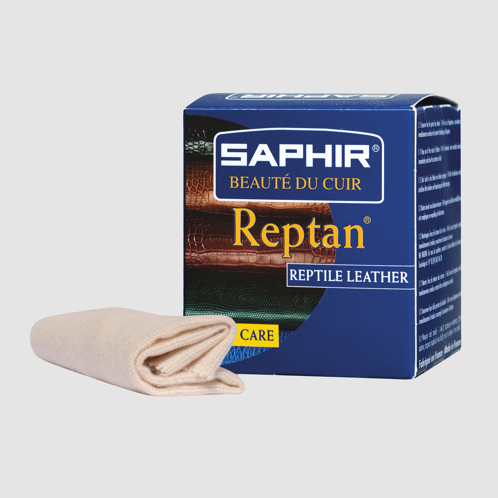 The Saphir Beauté du Cuir Reptan is a specially formulated cream designed to care for and protect exotic leather goods such as crocodile, lizard, snake, and other reptile skins. Its gentle composition nourishes, restores suppleness, and enhances the natural sheen of delicate leathers without altering their unique texture or finish. Ideal for shoes, handbags, belts, and other fine accessories.