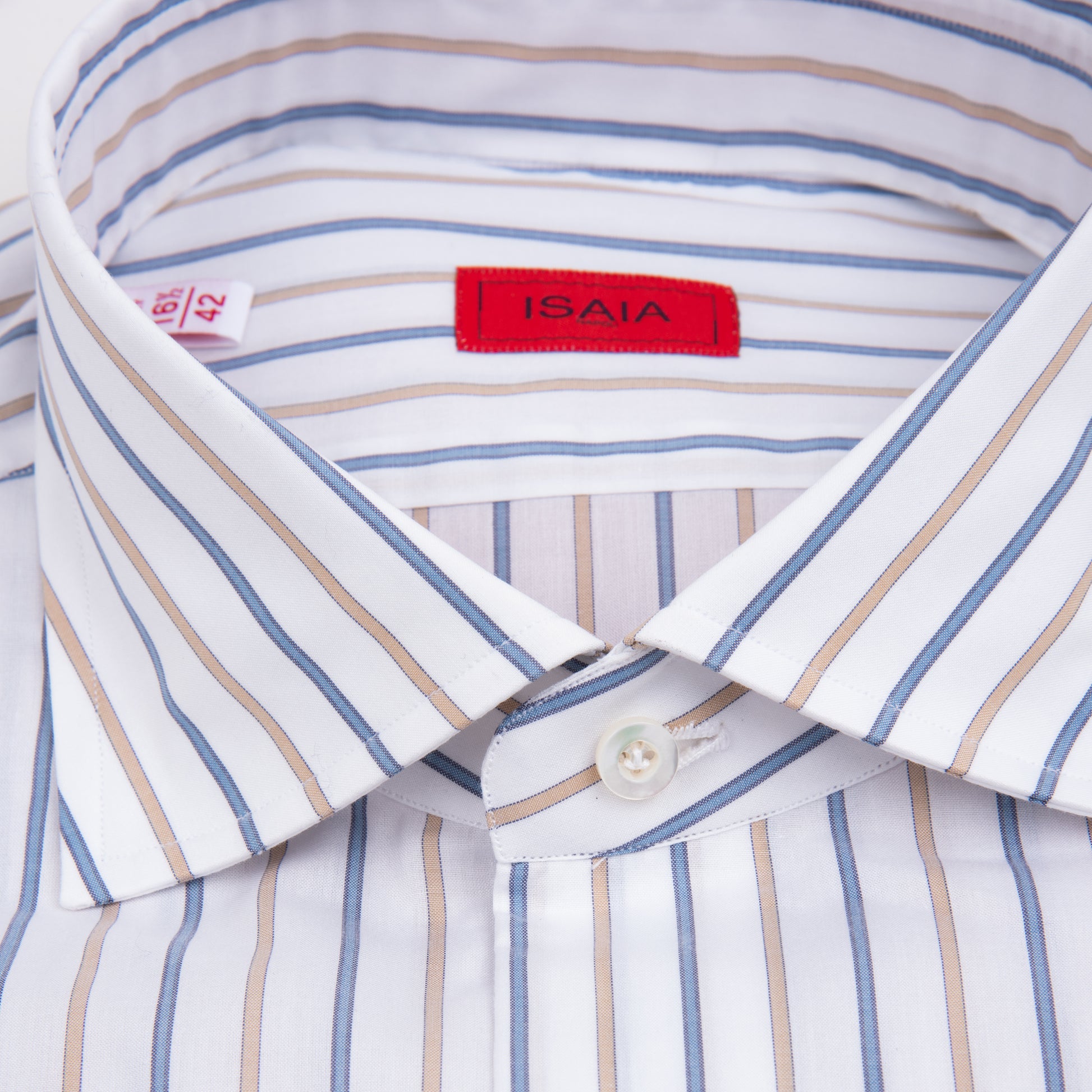 This sport shirt brings refined Italian elegance to a casual essential. Crafted from premium cotton, it features a clean stripe pattern in white, beige, and blue offering a sophisticated balance of color and versatility. Lightweight, breathable, and exceptionally soft, this shirt is ideal for year round wear. Whether paired with tailored trousers or casual denim, it adds a polished touch to any wardrobe.