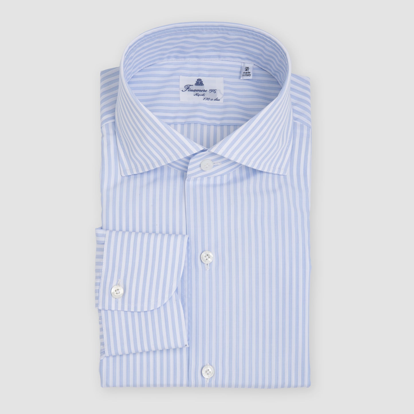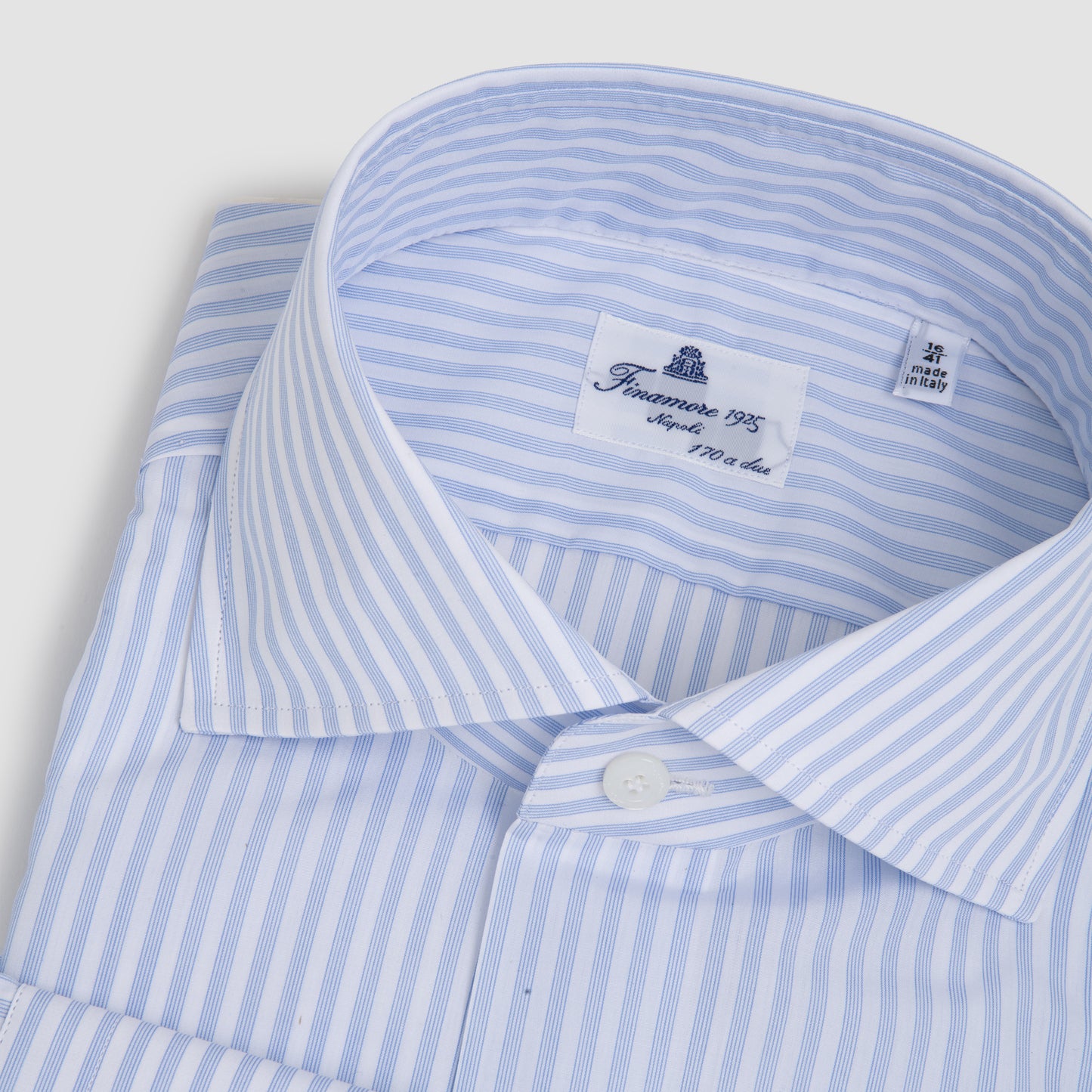 This elegant dress shirt from Finamore is crafted from luxurious cotton, offering exceptional softness, refined hand. Featuring classic blue and white stripes, it’s cut in the tailored Napoli fit with a sharp Eduardo spread collar making it an ideal choice for sophisticated office wear or formal occasions.