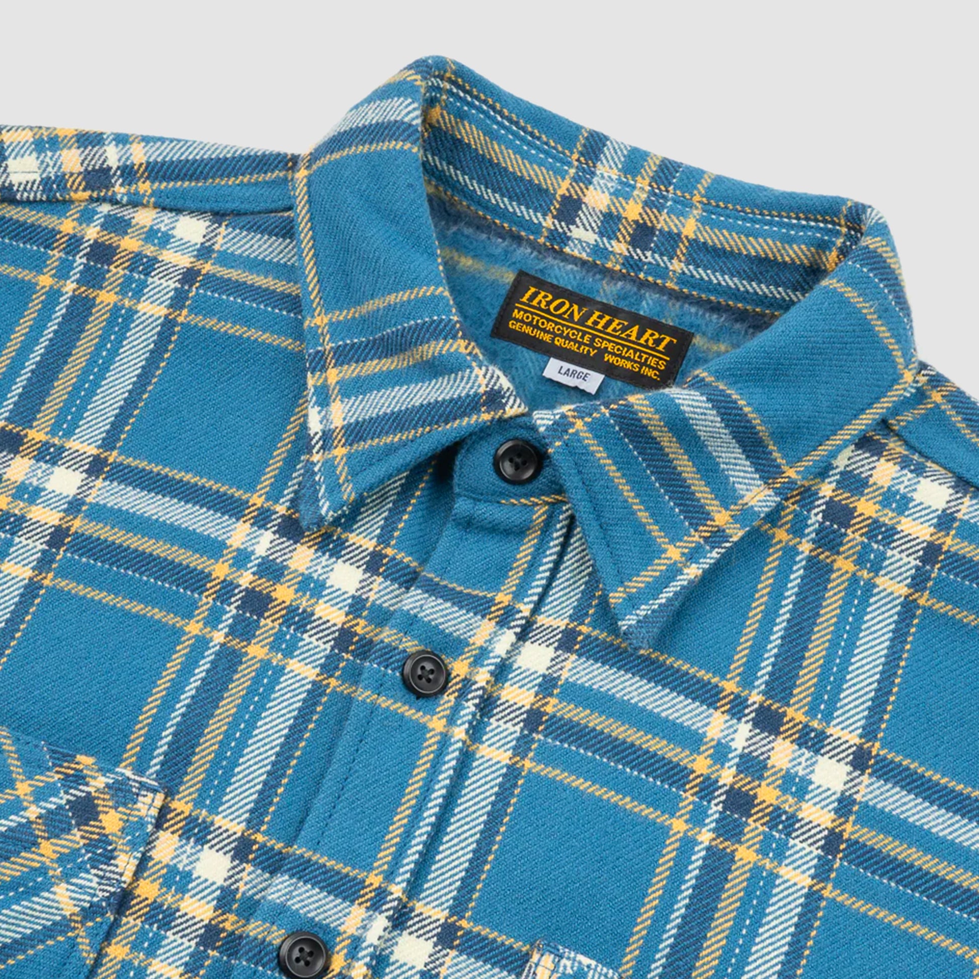 To a great extent, our ultra heavy flannel (UHF) shirts define Iron Heart: heavy, rugged, but amazingly wearable. The 12oz fabric is woven with Aspero cotton from the foothills of the Andes mountains. We double brush it on the inside and single brush it on the outside, resulting in a very soft yet substantial, thick, warm and windproof flannel. This shirt is a wardrobe staple—seen here in our work shirt cut with a blue American check.